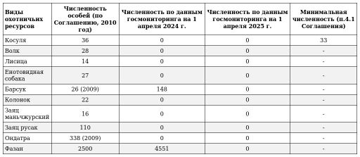 Как следует из искового заявления Минлесхоза Приморья, в 2024-2025 гг. общество формально провело учёт косули, кабана, зайцев и других видов, но с такими нарушениями методик, что данные оказались непригодны. Фактически, уже два года никто не знает, сколько животных осталось на этой территории (Октябрьский округ) и как они себя чувствуют. Без этого невозможно установить лимиты добычи, что создает угрозу неконтролируемого истребления.