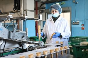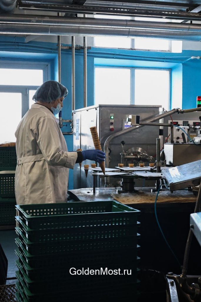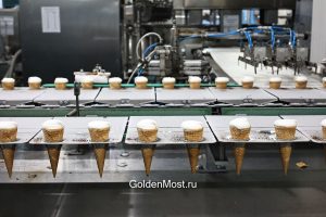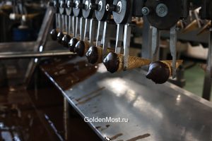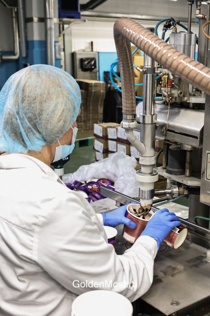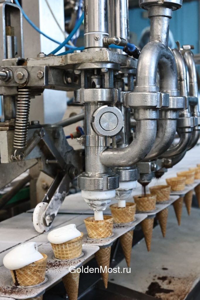 Строгий пропускной режим, стерильная чистота помещений, обязательные маски на лицо и шапочки на волосы — это стандартное начало путешествия. Стальной блеск оборудования перемешивается здесь с приятным ароматом шоколада и молока. В день, когда мы приехали, выпускали шоколадные рожки и мороженое «Прага». Технологический цикл таков, что в один день выпускают одни виды мороженого, а в последующие дни — другие. Фабрика, как пульсирующее сердце, не останавливает свою работу никогда.